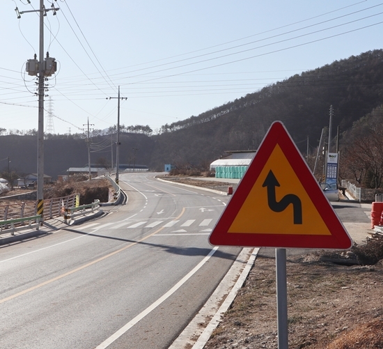 | ↑↑ 도로 선형이 개선된 공근면 청곡2리 도로. 기존 ‘좌우로굽은이중도로’ 표지판만 그대로 유지돼 고원식 횡단보도에 대한 운전자의 인지가 어렵다. |