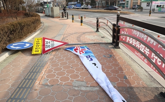 지난 15일 횡성읍 만세공원 인근에 걸려있던 불법 현수막이 강풍으로 하중을 받으면서 묶여있던 도로교통표지판을 인도 쪽으로 쓰러트렸다.