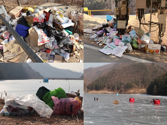 마을 주민 A씨는 “빙판 낚시를 즐기러 온 낚시꾼들이 무단으로 버린 쓰레기들이 저수지를 덮고 있다”며 “주말에는 좁은 도로가 낚시꾼들의 차들로 막혀 귀가도 못하는 상황이 벌어졌었다”고 말했다.