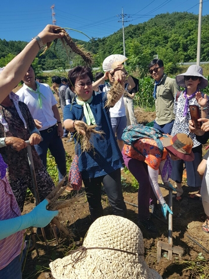 | ↑↑ 지난해 8월, KTX를 타고 횡성을 찾은 수도권 관광객들이 청일면에서 횡성더덕 캐기 체험에 참여하고 있는 모습 |