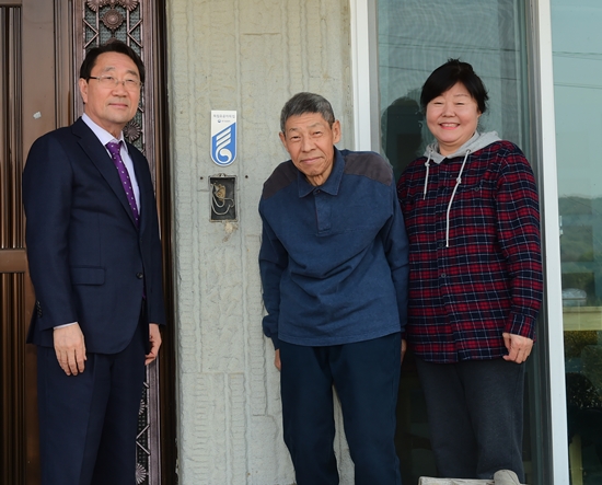 | ↑↑ 지난 4일 한규호 군수가 애국지사 고(故)원후정 선생의 유족 원봉의씨의 자택을 찾아 위문하고 독립유공자 명패를 직접 달아주고 있다. |