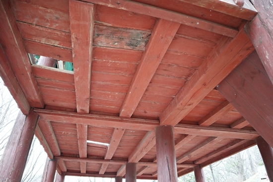 | ↑↑ 태풍루 밑을 본 모습. 멍에가 휘었고, 바닥에 깔린 목재는 탈락·곰팡이로 손상됐다. |