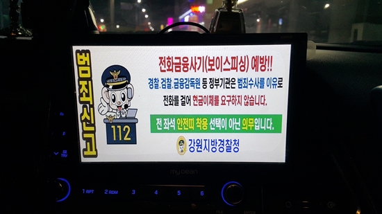 횡성경찰서(서장 탁기주)가 관내 개인·법인 택시 80여대에 탑승 시 보이스피싱 예방 홍보 문안과 음성안내가 나오게 해 범죄예방에 나섰다. 횡성경찰서는 다수의 주민을 대상으로 보이스피싱 범죄에 대해 경각심을 일으키고 오랜 기간 가능한 홍보 방안이라고 밝혔다.