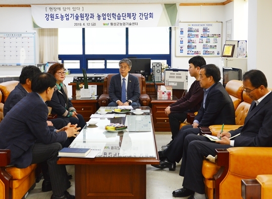 어려운 농업현실을 극복하는 해법을 현장에서 찾고자 지난 12일 강원도농업기술원 최종태 원장은 횡성군을 방문해 신상훈 횡성군농업기술센터 소장과 함께 주요 사업장을 둘러보고 당면한 농업 추진현황 점검 및 횡성군농업인학습단체장과의 간담회를 실시했다.