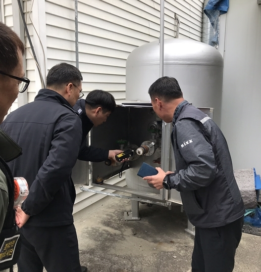 관계인과 정확한 냄새 원인을 찾아 나선 이들은 건물 외부에 설치된 500㎏ LPG 가스 저장탱크를 가스누출경보기 및 비누거품 등을 이용해 가스누출 여부를 검사한 결과, 탱크 가스압력게이지 이음새 조임이 헐거워지면서 가스가 누출된 것을 확인하고 신속히 가스업체에 연락해 안전조치를 취했다.
