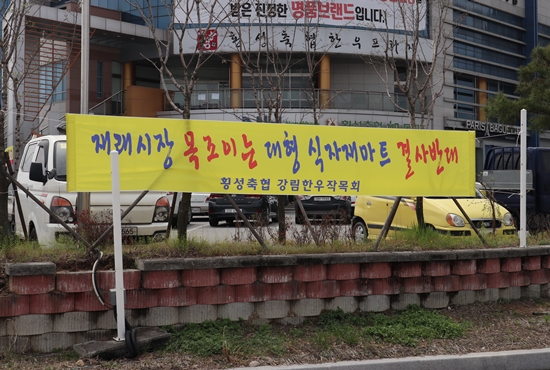 해당 중대형 식자재 마트 입점 제지를 위해 횡성시장조합, 횡성5일장 상인회, 횡성축협, 횡성축협 한우작목연합회 등에서 현수막을 내걸었다.