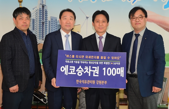 지난 22일 한국석유관리원 강원본부는 군청에서 대중교통 이용 활성화로 미세먼지 발생을 줄이고자 대중교통이용 서명록에 서명을 하는 군민들을 대상으로 횡성군농어촌버스 1회 탑승이 가능한 ‘에코 승차권’을 지급했다.