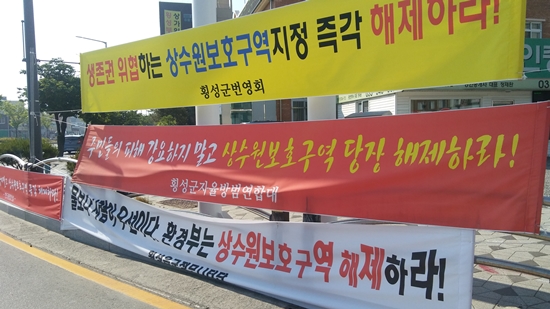 | ↑↑ 관내 곳곳에 기관단체들이 상수원보호구역 해제를 촉구하는 현수막을 내걸었다. |