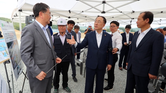 KTX편으로 횡성을 찾은 홍남기 경제부총리는 협약식 참석에 앞서 이모빌리티 산업 거점지인 우천산업단지를 방문, 임대차공장 건설현장에 대한 브리핑을 받았다.