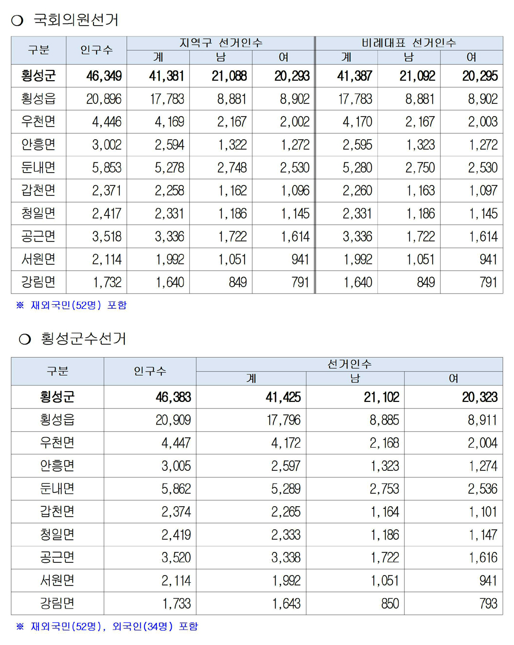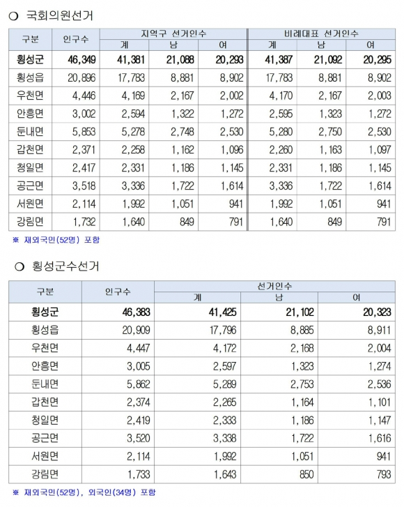 | 오는 4월 15일 실시되는 제21대 국회의원·군수보궐선거 횡성군 선거인수가(국회의원선거 41,381명, 국회의원 비례대표선거 41,387명, 군수보궐선거 41,425명) 확정됐다.