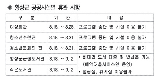 | 또한 횡성군은 코로나19의 지역사회 확산 방지 및 주민 안전을 위해 여성회관, 도서관 등의 공공시설을 임시 휴관하기로 결정했다.