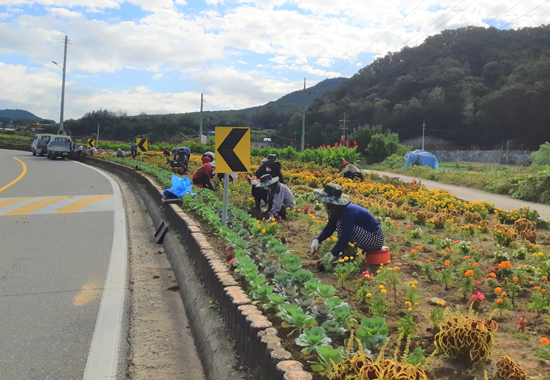 | ↑↑ 서원면 코로나19 극복 희망일자리사업 근로자들이 도로변 꽃묘 식재 작업을 하고 있다. |