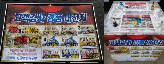 | ↑↑ 사진은 고객감사 경품 대찬치 행사 때 A대형마트 건물에 내걸린 홍보 현수막과 매장에 놓인 경품추첨권 추첨함 |