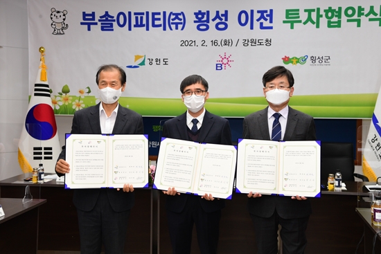 | 강원도와 횡성군은 경기도 화성시에 위치한 전기자동차 엔진제조업체인 부솔이피티㈜의 지방이전 투자를 유치, 2월 16일 오전 11시 강원도청에서 3개 기관이 투자협약(MOU)을 체결했다.