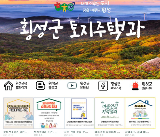 | 횡성군 토지주택과가 비대면 시대 맞춤형 주민 홍보를 위해 블로그를 개설하고 운영 중에 있다. 코로나19로 가속화된 비대면 시대에 적합한 정보 전달과 행정 만족도 제고를 위해 지난 1월 블로그를 개설했다.