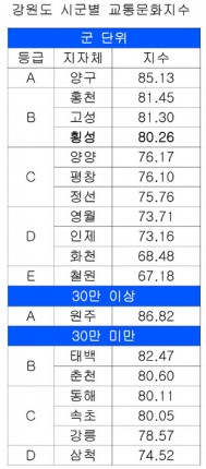 도내 군 단위 교통문화지수를 보면 양구군 3위(A등급·85.13점), 홍천군 13위(B등급·81.45점), 고성군 14위(B등급·81.30점), 횡성군 19위(B등급·80.26점), 양양군 35위(C등급·76.17점), 평창군 36위(C등급·76.10점) 순으로 나타났다. 인근 원주시의 경우 30만 이상 시 단위 중 1위(A등급·86.82점)를 차지했다.