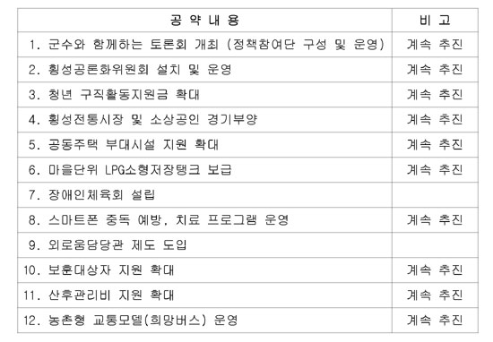 물리적인 시간이 부족한 탓이 크다. 하지만 이미 내건 공약인 만큼 어떻게든 임기내에 이행률을 끌어올려야 하는데 남은 임기 1년 동안 군민이 피부로 느낄 수 있는 성과를 낸다는 것은 여전히 부담으로 남는다. 100대 공약 중 지난 1년 동안 완료된 공약 12개는 다음과 같다. (자료 : 횡성군 홈페이지)
