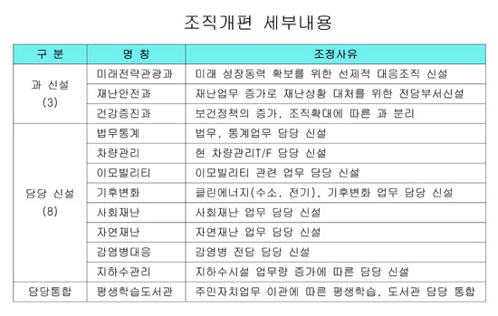 기획감사실은 법무업무를 이관해 법무통계 담당을 신설하고 자치행정과에는 차량관리 담당, 기업경제과에는 이모빌리티 담당이 신설된다. 새로 생기는 미래전략관광과는 전략산업, 관광개발, 에너지, 기후변화 담당으로 구성되고, 재난안전과는 사회재난, 자연재난, 복구지원 담당으로 구성된다. 기존의 안전건설과는 건설행정만을 담당하게 된다.