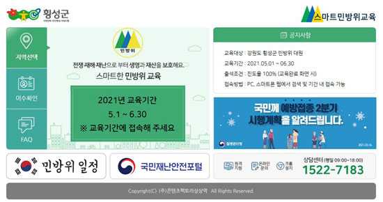 이번 비대면 스마트교육은 집합교육으로 발생할 수 있는 감염병 확산을 방지하기 위한 것으로 횡성군 소속 민방위 대원이라면 누구나 5월 1일부터 6월 30일까지 컴퓨터와 스마트폰을 이용해 교육을 받을 수 있다. 1시간 가량의 교육수강 후 평가를 통과하면 별도의 비상소집 훈련에 참여하지 않아도 된다