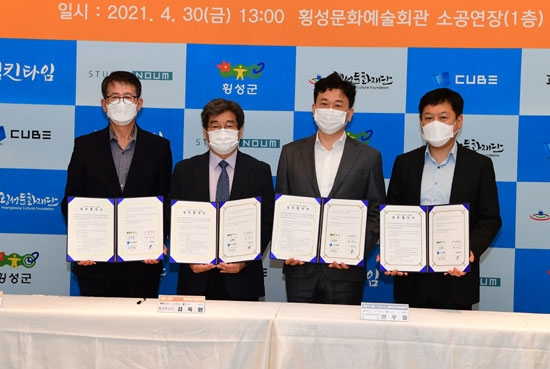 | 횡성군은 4월 30일 제작사 ‘큐브엔터테인먼트’ 및 ‘스튜디오 노움’과 시네 드라마 ‘펌킨타임’ 제작지원 협약식을 개최했다.