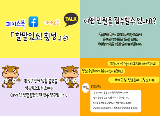 | 횡성군이 생활불편민원 전용 창구 ‘할말있소! 횡성’을 페이스북과 카카오채널에 개설하고 군민 불편 사항 해소에 적극 나섰다.