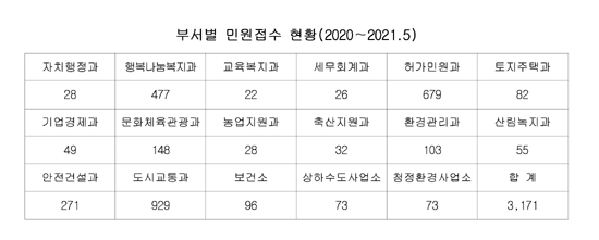 | 지난 6월 16일부터 시작된 횡성군의회 행정사무감사 자료에 따르면 2020~2021. 5월까지 부서별로 접수해 처리한 민원은 총 3,171건에 달한다(표 참조).