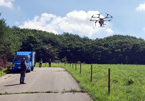 대상지는 도축산기술연구소(둔내면 현천리 소재) 목초지 80㏊ 가운데 15㏊로 드론방제가 이뤄졌다. 사전에 65㏊는 축산기술연구소 자체 방제를 진행했고, 인력으로 방제할 수 없는 경사지를 중심으로 드론방제가 이뤄졌다.