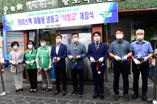 | 아이스팩 재활용 냉동고 석빙고 개장식이 지난 16일 오전 9시 40분 횡성시장 내 시장조합 앞에서 열렸다.