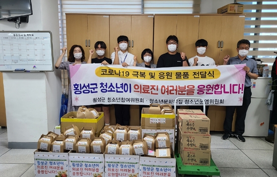 | 횡성군청소년참여위원회(위원장 김민재)와 횡성군청소년문화의집 청소년운영위원회(위원장 강성길)가 7월 28일 보건소를 찾아 의료진에게 응원 물품 200세트(직접 만든 빵과 쿠키, 사탕, 음료수 등)를 전달했다.