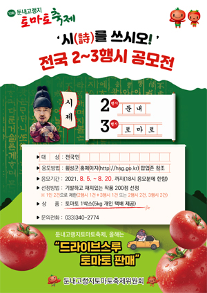 | ⓒ 횡성뉴스 | 둔내고랭지토마토축제위원회(위원장 표한상)는 8월 5일부터 20일까지 2∼3행시 공모전을 개최한다.