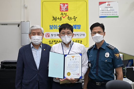 | 횡성축협 한우로지점 한영환 계장이 보이스피싱 범죄로부터 고객의 돈 2,000만원을 지켜 지난 18일 횡성경찰서로부터 감사장을 받았다.