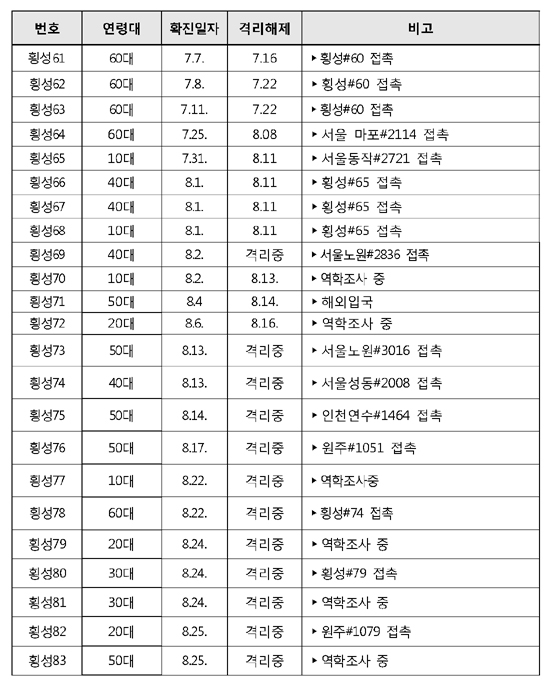 | 8월 25일 횡성군 코로나19 확진자가 2명 추가로 발생하면서 이날 현재 누적확진자는 83명이 됐다. 8월 한달 확진자가 25일 현재 18명으로 월별 최대 발생을 기록하면서 군의 방역 긴장도가 한층 높아졌다.