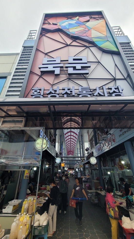 횡성전통시장은 최근 획기적으로 변했다. 꽉 막힌 지붕을 털어내고 아케이드를 설치해 밝고 쾌적한 환경을 만들었다. 간판도 정비하고 여름엔 시원한 물안개로 더위를 식혀주기도 한다.