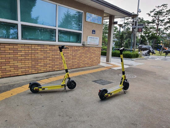 얼마 전 횡성읍 만세공원 입구에 전동킥보드 2대가 주차돼 있어 주민 A씨는 전동킥보드를 피해 걷느라 애를 먹었다고 말했다.
