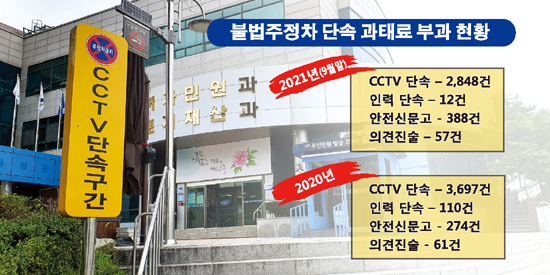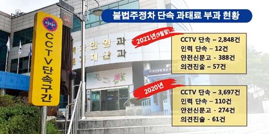 올해 9월말 기준 불법주정차 단속 건수를 살펴보면 CCTV 단속 2,848건, 인력(차량)단속 12건, 안전신문고 388건, 의견진술 57건에 달한다. 지난해 110건과 비교하면 인력(차량)단속은 9배정도 줄어들었고 차량과 인력은 줄어들지는 않았다.