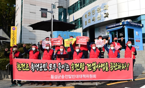 | 횡성군송전탑반대대책위원회(위원장 차희수·이하 송전탑반대위)와 횡성군이장협의회(협의회장 장대근)는 10월 26일 오후 3시 횡성군청 허가민원과 앞에서 한전의 송전선로 건설사업 주민 기만행위 규탄 성명서를 발표했다.