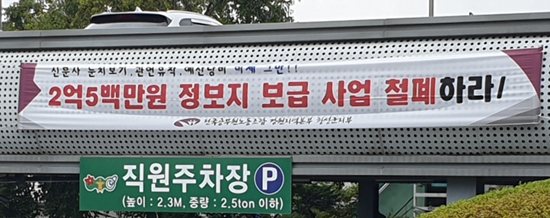 | ↑↑ 횡성군 공무원노조에서는 군청 인근에 “정보지 보급 사업 철폐하라”고 현수막을 걸어 놓았다. |