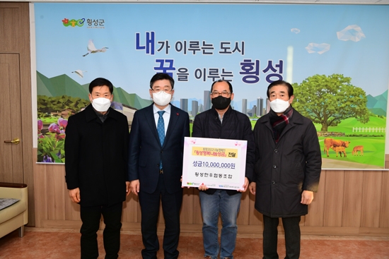 | 횡성한우협동조합(이사장 조원섭)은 12월 31일 오후 5시 군수집무실을 방문해 연말연시 어려운 이웃돕기 횡성행복나눔성금에 성금 1,000만원을 기탁했다.