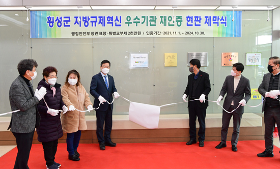 | 횡성군은 행정안전부 지방규제혁신 우수기관 재인증 현판 제막식을 지난 8일 오후 3시 군청 로비에서 가졌다.