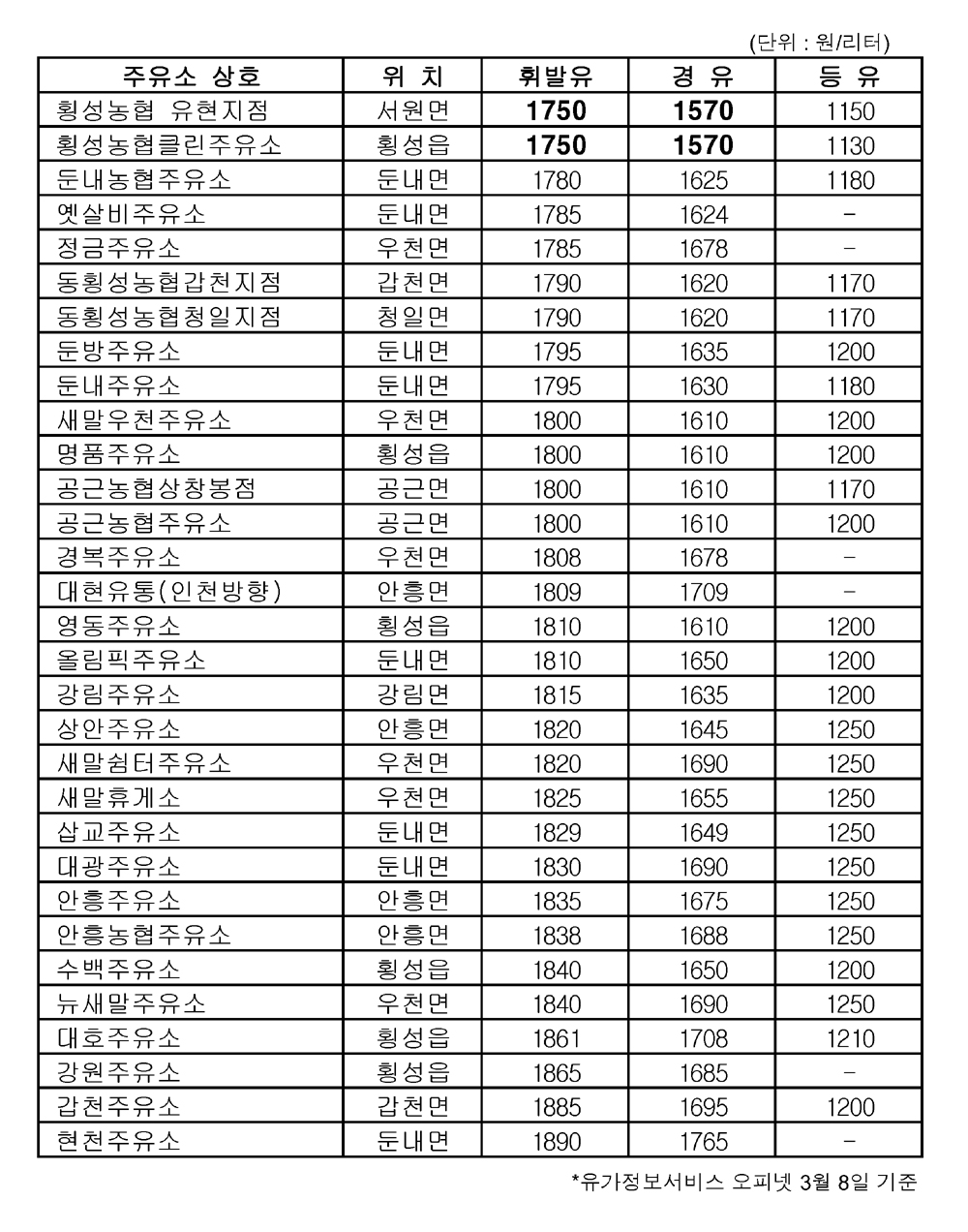 관내 31개소 주유소 중 횡성농협 클린·유현지점 저렴