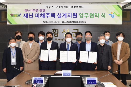 | 횡성군은 횡성지역 건축사협회(회장 조정식), 측량업협회(회장 이재일)와 재능기부를 통한 재난 피해주택 설계지원 업무협약을 지난 8일 오전 9시 30분 군청 소회의실에서 가졌다.