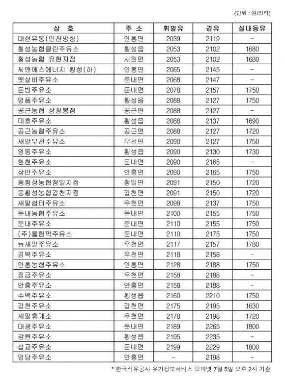 지난 7월 5일 한국석유공사 유가정보서비스 오피넷에 따르면 이날 오후 2시 기준 횡성지역 휘발유와 경유 평균가격은 리터당 2,111원, 2,162원을 기록했다. 32개소 주유소 중 평균가 보다 저렴하게 판매되고 있는 곳은 휘발유는 20곳, 경유는 19곳으로 나타났다.