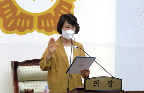 | ↑↑ 김영숙 군의장이 지난 4일 오후 횡성군의회 본회의장에서 열린 개원식에서 의원선서를 하고 있다. |