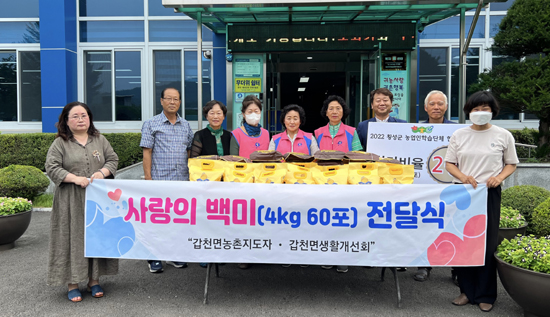 갑천면농촌지도자(회장 김영대)와 생활개선회(회장 김성녀)는 지난 20일 갑천면을 찾아 백미 4kg 60포를 지역 내 어려운 이웃들에게 전달해달라며 기탁했다.