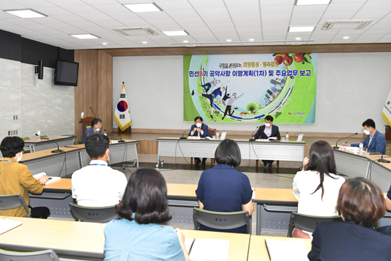 | ↑↑ 민선8기 공약사항 이행계획(1차) 및 주요업무 보고가 지난 19일 오후 1시 30분 군청 대회의실에서 김명기 군수가 참석한 가운데 1차로 기획감사실, 자치행정과, 복지정책과, 교육복지과, 허가민원과, 토지재산과, 세무회계과를 대상으로 진행됐으며 26일까지 4차례 걸쳐 각 실·과·소별로 실시한다. |