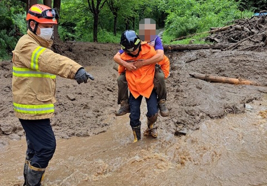 또 9일 낮 12시 54분쯤 둔내면 현천1리에서 산사태가 발생해 주택 한 채를 덮쳤다. 소방당국은 특수구조 장비와 굴착기 등 인력 69명을 투입해 매몰된 주택에 거주하던 70대 남성 1명이 빠져나오지 못한 것으로 보고 구조 작업을 벌였으나 사고 발생 4시간 만에 숨진 채 발견됐다.