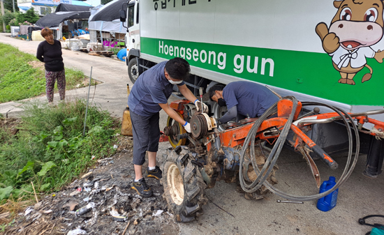| 횡성군은 농기계 수해 피해 농가를 방문(농기계 수리 지원 5톤 차량 진입 가능 장소까지)해 농기계 수리를 실시한다.