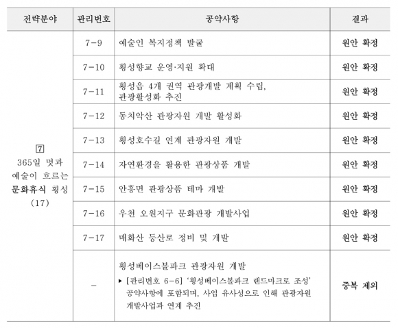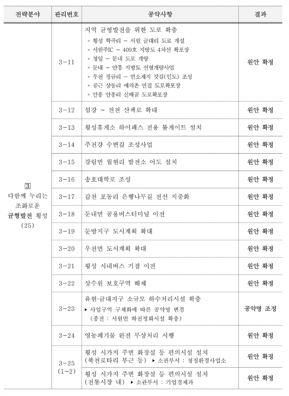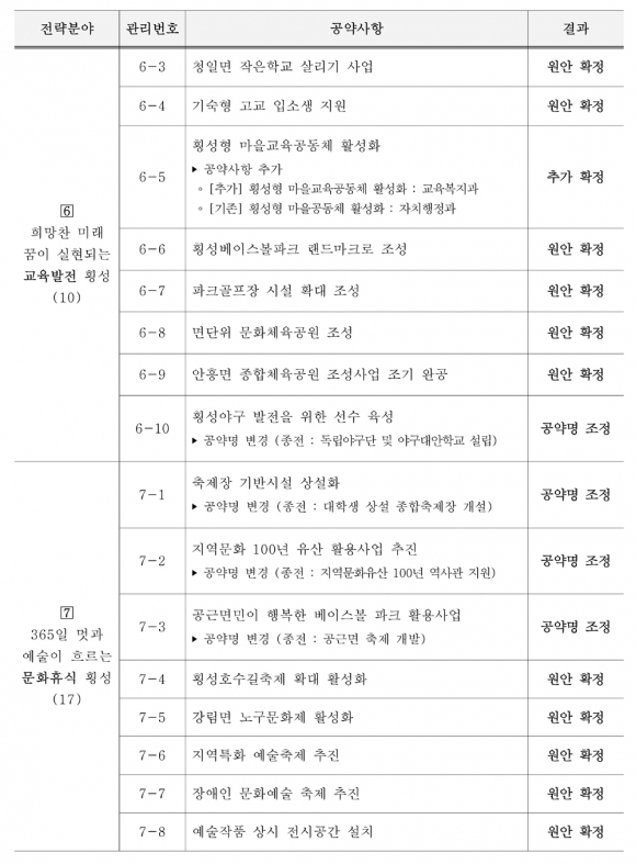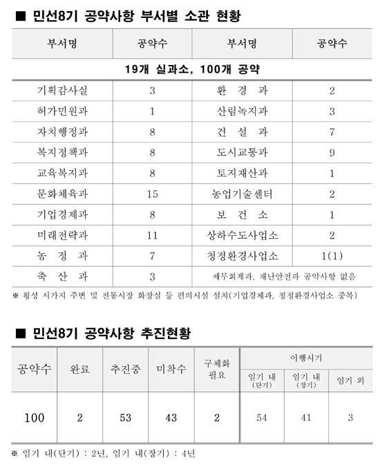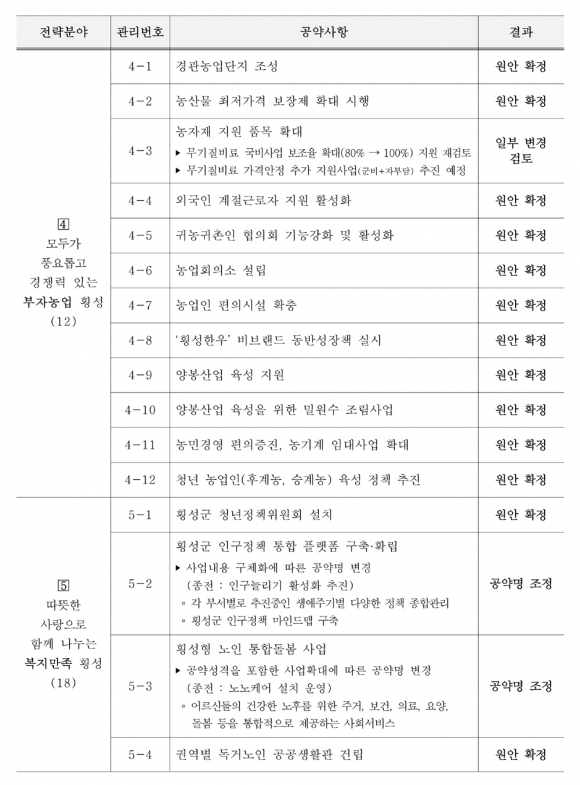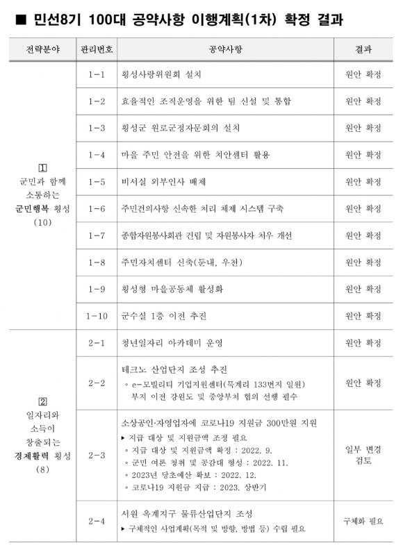민선8기 100대 공약사항을 7개 전략분야로 범주화한 내용으로 △군민과 함께 소통하는 군민행복 횡성 10개 △일자리와 소득이 창출되는 경제활력 횡성 8개 △다함께 누리는 조화로운 균형발전 횡성 25개 △모두가 풍요롭고 경쟁력 있는 부자농업 횡성 12개 △따뜻한 사랑으로 함께 나누는 복지만족 횡성 18개 △희망찬 미래, 꿈이 실현되는 교육발전 횡성 10개 △365일 멋과 예술이 흐르는 문화휴식 횡성 17개로 나누어 효율적으로 관리하고 이행하겠다고 했다.