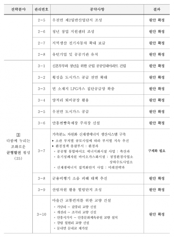 이밖에도 구체적인 공약 이행계획이 수립 중이거나, 추가 구상이 필요한 구체화 필요 공약은 총 2건으로 ‘서원 옥계지구 물류산업단지 조성’ 공약사항은 구체적인 공약사업의 목적, 방향 등의 기본구상을 명확히 할 필요가 있으며 ‘가축분뇨 자원화 신재생에너지 생산시스템 구축’ 공약사항은 환경정책 총괄부서인 환경과 주관으로 추진 관리 될 예정이라고 했다.