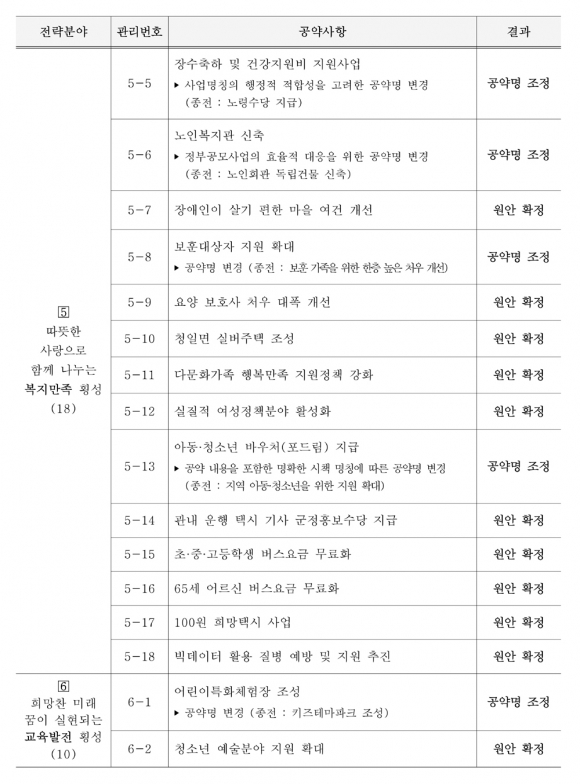 또한 민선8기 100대 공약사항 중 84건은 당초 구상대로 공약 이행계획을 원안 확정, 그 외 12건은 행정 현실에 맞도록 효율적으로 공약명을 일부 조정했고, 공약 이행계획의 일부 변경 검토가 필요한 공약사항은 총 2건으로 ‘소상공인·자영업자 코로나19 지원금 300만원 지원’ 공약은 지급 대상 및 기준에 대한 일부 변경 검토가 필요하다고 했다.